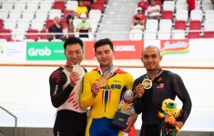 男子ケイリン表彰式。男子スプリント表彰式。左から銀メダル・新田祐大、金メダル・JAI ANGSUTHASAWIT、銅メダル・アジズル・ハスニ・アワン…