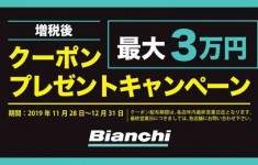 『増税後 最大3万円 クーポンプレゼントキャンペーン』は、ビアンキバイクストアにおいて、2019年11月28日から年内の各店最終営業日までの期間中、…