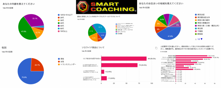 「自転車以外にもトライアスロン競技者も入っているからかもしれませんね。スマートコーチングのサイクルスクールに参加したことがあるというのは65%、未参加の方は35%。つまりスクールに参加したことがない人が35%も答えてくれた、というのがデータとしては面白いと思います。地域は東京都23区が42%、都下が9%。神奈川はサイクルスクールを実施する拠点が川崎と横浜の境界にあるので、川崎市、横浜市、川崎・横浜以外というデータを取っています」