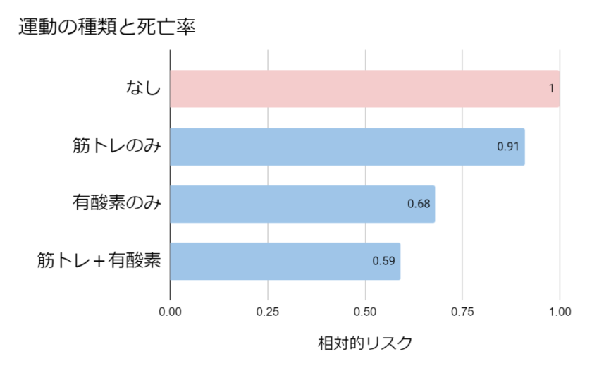 例えば、運動の種類と疾患別死亡率との関連を調べた研究では、筋トレと有酸素運動を組み合わせたグループが最も死亡率が低く、特に心疾患による死亡のリスクを大幅に減らせるということがわかりました。