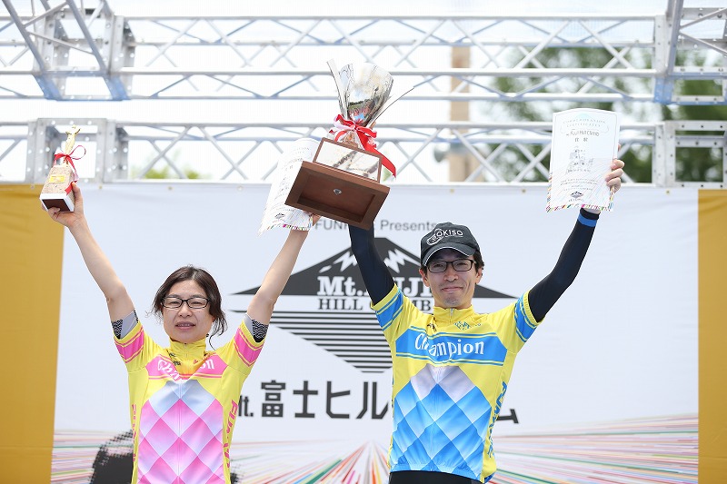 4合目の急こう配区間をこなしたところで、逃げ切りを確信する。あとはゴール勝負にむけた牽制をさけるため、また二人逃げを決めた兼松選手と真正面から勝負したくて、並走からのスプリントを持ちかけた。応じていただき、3つ目のシェードを超えて、ラスト100mというあたりで自分が先手を打ってスプリント開始し、先着。序盤のスローペースからは思いもよらなかったコースレコードでの優勝だった。