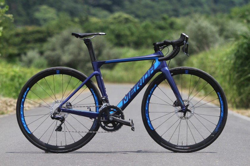 こちらはハンドルからホイールに至るまで、エアロパーツを搭載したワールドツアーチームのバーレーンメリダ チームモデル。そのエッジの効いたスタイルどおりのパワフルな走りを楽しむことができる。ハイディープリムは風向きによってはハンドリングに影響があるものの、踏み込むたびに聞こえてくるホイールからの反響音が加速を促し、さらにやる気にさせてくれる。シャープな形状の一体型カーボンハンドルバーの形状は好みがわかれるところだが、正面から風を切っていくパートでもあるので、空力特性の側面からすればアドバンテージとなるだろう。ディスクブレーキキャリパーの空冷装置もハードなライディングを考慮したもので、細部までこだわったバイクであることがわかる。完成車価格:¥1,200,000(R9100デュラエースDISC DI2)、フレームセット価格:¥369,000