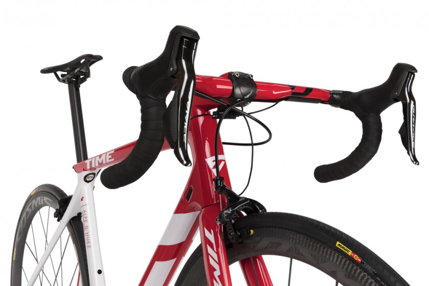 アルプデュエズが採用した新しい設計は、TIMEが培ってきたレーシングジオメトリーにコンパクト感と安定感を与えている。また、新型クイックセットにより、今までのクイックセットよりハンドル位置を9mm下げることが可能になり、上りでのポジションを最適化。同種のバイクよりもスロープ角が大きく、コンパクトで剛性の高いフレームが完成した。既存モデルのフルイディティ、アルプデュエズ21のようなBB中心からサドル中心までのシート角74.5°ではなく1.5°立たせ、シートポストのオフセット0mmのダイレクトリンクによって、パワー伝達効率も向上しているという。