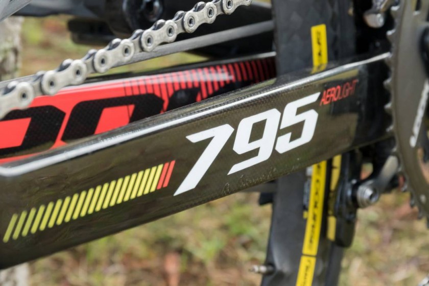 795ライトよりも幾分フォーク、およびリア側の剛性が抑えられている印象で、レーシングモデルながらどっしりとした安定感を感じる。高級車に乗っているような、ラグジュアリー感はほかのバイクでは感じ得ない感覚であった。安定感があるとはいえ、それが「もっさり」といったネガな印象に繋がるわけではない。BB部などぺダリングパワーを伝達する部分に関しては高剛性であり、あくまでレーシー。走行性能と快適性が見事に両立されている。