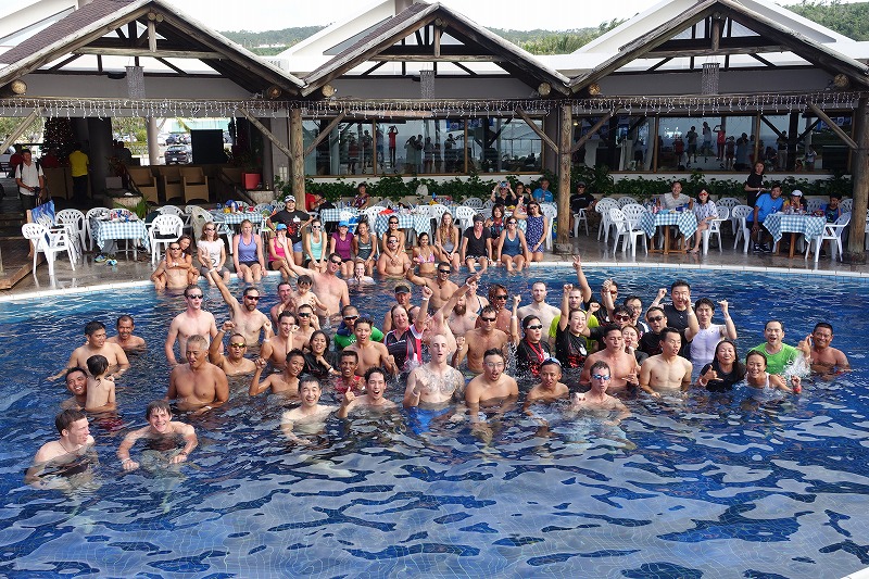 MTBの部から表彰式が始まり、カテゴリーが多いので表彰対象者も多い。とくに地元の人が呼ばれると会場は異常に盛り上がる。イシムさんは年代別で二位! 昨年同様、加工の適当な栓抜きのメダル。この適当さがいいところ。女子のロードも昨年に引き続きグアム在住のミエコさんが優勝。というわけで男女ともに日本人の勝利! 昨年はステージの前で撮った集合写真。今年のステージの前はプール。となるとやることはひとつ。