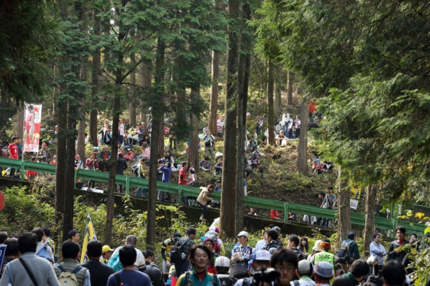 コース一番の上り、古賀志林道は今年も多くの観客が詰めかけた。コーナーのイン側には観客が立たないなど、観戦マナーも守られていた