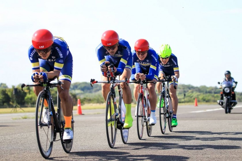 このコースは滑走路を往復する平地のイメージですが、やや傾斜があり、さらに高台にあることでもろに風の影響を受けやすいのです。当日も風が強く、上り基調側のコースが向かい風というコンディション。チームTTではこの強い風圧をどう負担するかがキーとなりそうです。1チーム6名参加できるところを、チームからエントリーしたのは5名。さらに当日予定が重なり参加できなくなった選手が1名おり、4名でスタートすることになりました。もちろん上位チームをはじめ、ほとんどのチームはフルメンバーで参加(当たり前のこと)。人数が少ないことはハンディ以外の何者でもないですね。チームは3組目のスタート。風が弱まることを期待しつつも、それも空しく正面やや右側から強い風が吹きつける。