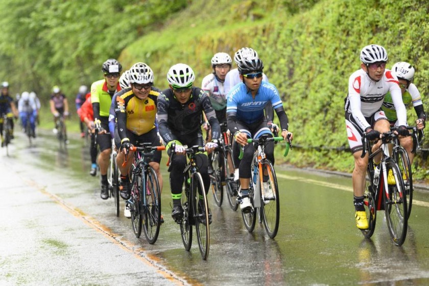Mt.富士ヒルクライムの定番企画「チームFR90」。90分切りのブロンズリングを目指すサイクリストを、豪華ライダーがペースメーカーとなってサポートする。今年は藤田晃三さん(ブリヂストンサイクル)、須田晋太郎さん(ウォークライド)が参加者およそ40人を先導、さらにスタート前にサプライズゲストとして飯島誠さん(ブリヂストンサイクル)も加わり、雨の富士スバルラインを声を掛け合いながら走り抜けた。