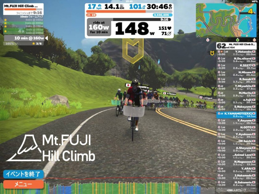 イベント自体は画面に表示されたワットを指示された時間分、ペダルを漕ぎ続ければ異なるFTPのグループでも集団で走ることができるので、周りのみんなと一緒に走るという安心感と、モチベーションが保たれる、ハズ。