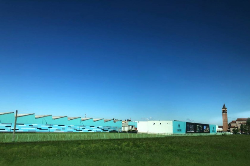 澄み切った青空にチェレステカラーの社屋が映える。なるほど、ビアンキのコーポレートカラーの生まれた由来がこの青空と言われれば納得。ビアンキの長い歴史を感じさせるモダンな建造物だ。