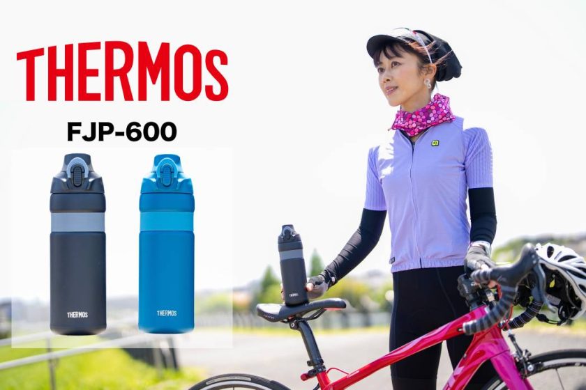 2017年より自転車専用ボトルを発売しているサーモス。最新モデルのFJP-600は保冷専用スポーツボトルです。ワンタッチ・オープンで片手で素早く水分補給ができるのがポイント。空気穴付きの飲み口構造で、飲み口をくわえても一気に飲むことができます。