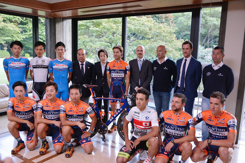 「NIPPO・ヴィーニファンティー二は自転車だけでなく文化的にも、色々なスポンサーの協力によってプロジェクトが成立すると思っている。日本とイタリア、両方の基盤をもっているのは自転車においては珍しい存在で、ほかのスポーツにも注目をされている。プロコンチネンタルチームという世界で2番目に高いカテゴリーに属しており、トップカテゴリーのワールドツアーのレースに出場することができる。たとえばジロ・ディタリアや、オーストラリアでおこなわれる、カデル・エヴァンスなど、トップレベルのレース180大会に出場することができる。2020年東京オリンピックにむけて、日本人選手が多くの世界レベルのレースに出場できるようにしたい。感謝すべきは私たちを支えるスポンサー。スポンサーの存在が選手たちを大きく成長させてくれる。本日紹介したJAPANプロサイクリングに参加できるということはとても光栄。新規加入する4名の選手はこのプロジェクトに初めて参加する選手となる。日本とイタリアは遠く、文化も異なるが、1つとなって若い選手を育てて、オリンピックに向けて努力したい」