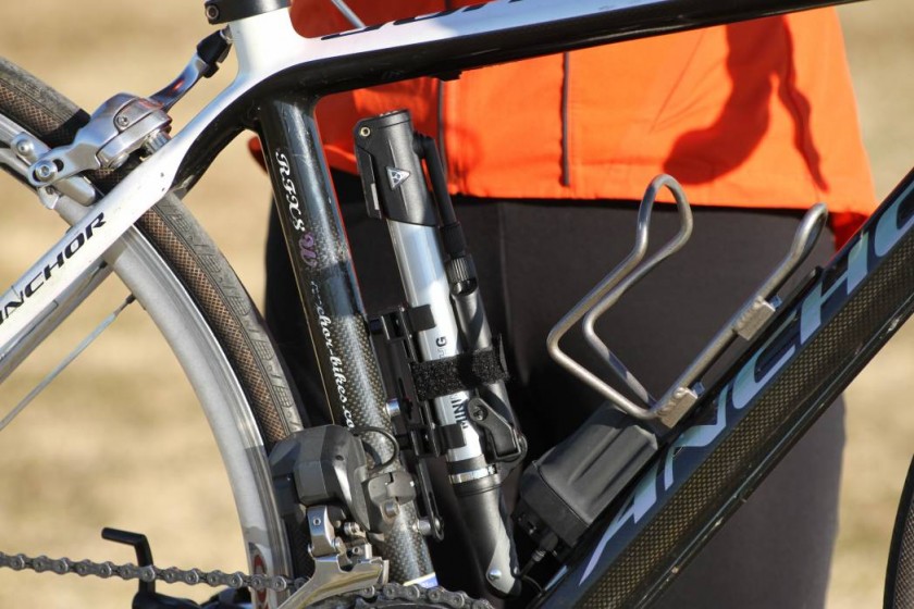 ポンプ下部のホースが生えている部分が、ちょうどバッテリーに干渉してトップチューブ側が入らない。そこまで小さかったのか、ちゅなどんのフレーム。ということで、苦し紛れに上下逆さまにして差し込んでみたら、ポンプの頭側は角が削れたデザインになっている分、すんなり装着できました。ホッ。これでようやく使うことができる。