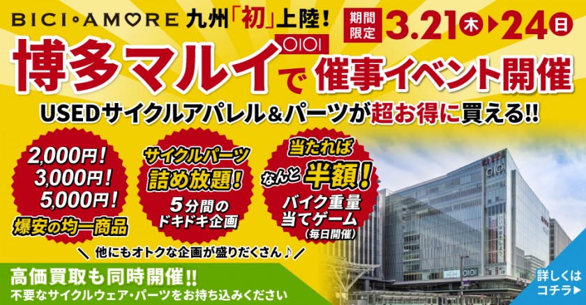 USEDサイクルアパレル&パーツを取り扱うBICI AMOREが福岡県の博多マルイ(〒812-0012 福岡県福岡市博多区博多駅中央街9−1)にて期間の催事イベントを実施。USEDのサイクルアパレル&パーツがお買い得な価格で購入できる。期間は3/21〜24の4日間だ。