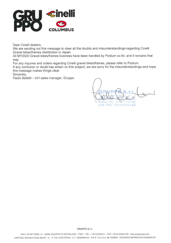 日本でのチネリグラベルバイク・フレーム販売に関して疑念や誤解があるようです。
