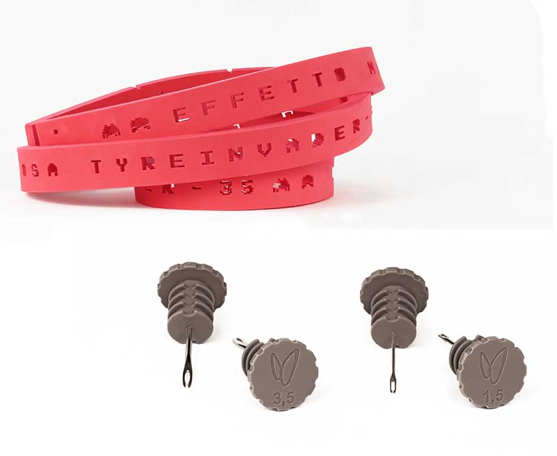 「Tyreinvader」の素材はスポーツシューズ業界で一般的に使用されている高密度EVAでとても軽く(35mm=48g)、水分を吸収しないのでタイヤシーラント剤と一緒に使用できる。