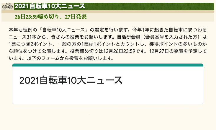 【NPO法人 自転車活用推進研究会】みんなで選ぼう!自転車10大ニュース総選挙 /2021年度投票募集中。12月26日締切