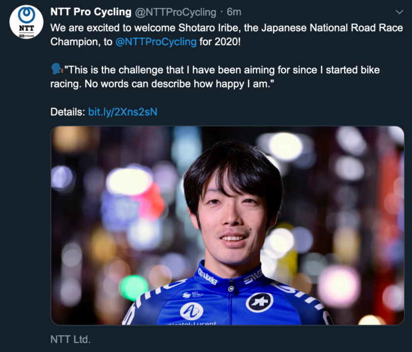 We are excited to welcome Shotaro Iribe, the Japanese National Road Race Champion, to @NTTProCycling for 2020!
