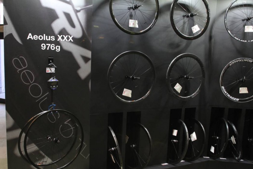 ボントレガーのNEWカーボンホイールはロープロファイルの最軽量モデル、アイオロスXXXチューブラーホイール。前後合わせて976gという超軽量ながらも優れた比強度でなんと体重制限はない。その秘密はOCLVカーボンを用いたこと、Stacked Lacing(スポークを支える角度が広がり、ホイール剛性がアップ)を採用したことなどだろう。チューブラーのみのラインナップだ。