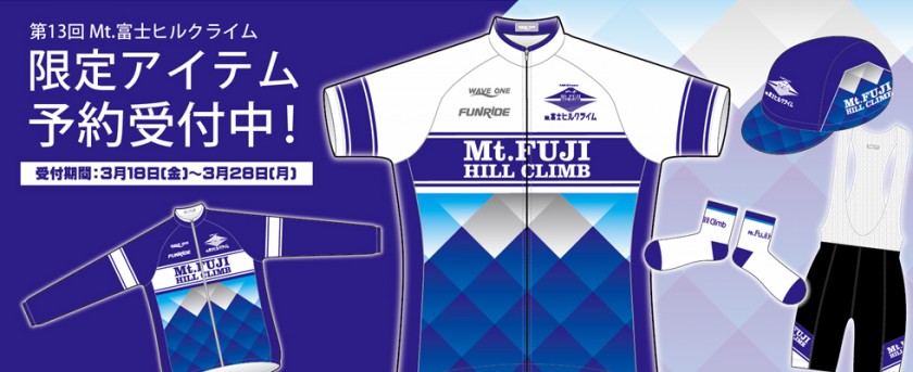 第13回Mt.富士ヒルクライムの開催に際して、大会オフィシャルパートナーのウエイブワンより大会オリジナルウエアの販売が決定しました。