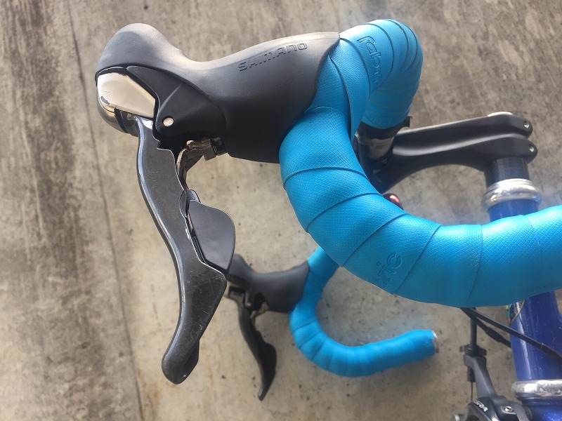 理由:薄手のバーテープの方が握りやすいのと、クリアバーテープの下に反射テープを巻いて夜間走行でも目立つようにしています。