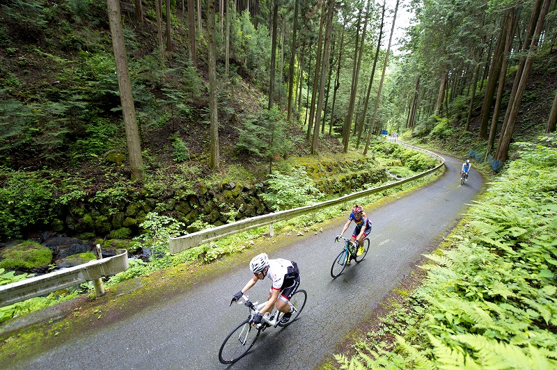 めまぐるしく伸び縮みする集団走行はロードレースを見ているよう。レベルにかかわらず、前半の5km区間の走り方、位置どりが後半の激坂区間での走りに直結していく。前半は脚を使わずに抑えて、後半に温存するのが定石なのだけれど、透き通るような清流成木川がそばを流れるコースは開放的で、肌に感じる風も気持ちがよく、ついついペースを上げてしまう。もしかしたら沿道で目を輝かせながら応援してくれる村人の応援も原因のひとつかもしれない。