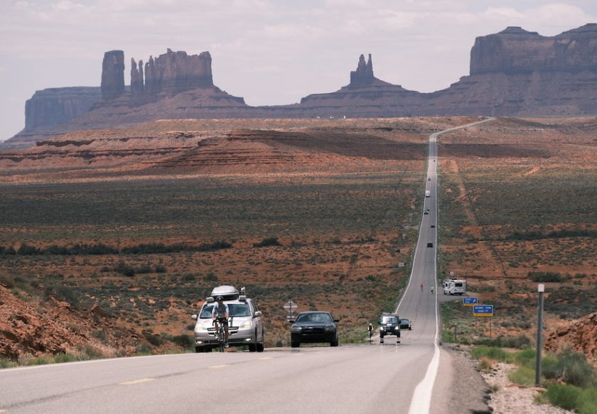 到着する前に目が覚める。仮眠前に補給を忘れていたため、ハンガーノックに陥り、体温がキープできなくなっていた。気付いた時にはすでに遅く、空腹で目が回っていた。交通ルールギリギリの速度で私を運ぼうとするクルーのドライビングテクニックの中、運転中に補給を取るのは車酔いをするのではないか、という不安があった。さらに、深夜のフラッグスタッフは気温が低く、ウェアの準備もできていなかったので、到着後の出発までに時間がかかってしまった。深夜なのに5台ほどの車が停まっており、まだまだ混戦状況であることが伺えた。