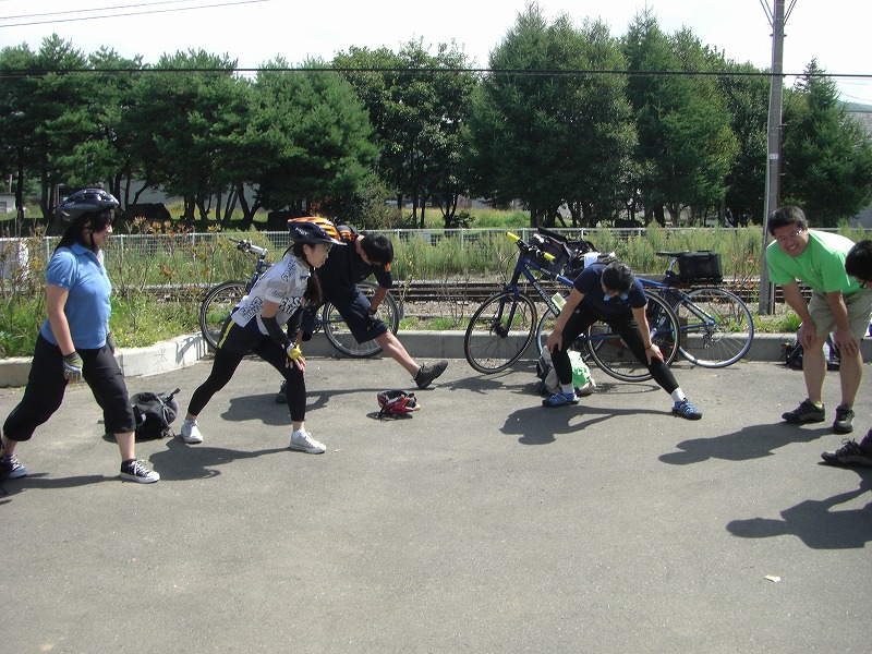 乗り始めてから体が温まるまでの間は、ウォームアップ走行として普段よりも軽めのギアを回しながらゆっくりめに走り出す。休憩の時間にもストレッチをしたほうが良い。とくに脚周りや背中、腰などは痛みやコリにもなりやすいので、休憩の度に頻繁にストレッチをすれば予防効果があり、疲れも溜まりにくくなる。